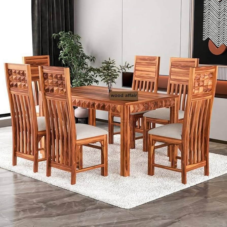 • Design: A six-seater set featuring a rectangular table with intricate hand-carved geometric patterns on the apron. The high-back chairs include matching carved top panels and vertical slat supports with light-colored padded seats.